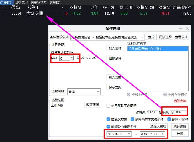 如下图,我们把LBS设置成0,把选股器时间定格在2024年7月10号,全网就大众交通这一票当天涨停板反包前阴,这支无人驾驶龙头就是这样被我写的龙头首阴反阴战法给选出来,就是这么牛!但7月10号这票一字涨停板,你很难买进,没办法,龙头一旦确认地位就是这样,一字板代表市场大资金的认可,后面一般会有资金抢着挂单买入。