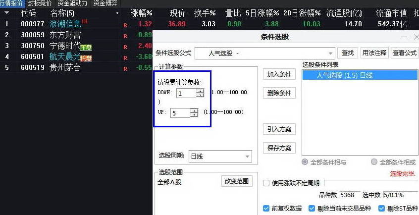 我个人默认设置为1和5表示选出当天人气排行榜第1名到第5名的股票,如下。