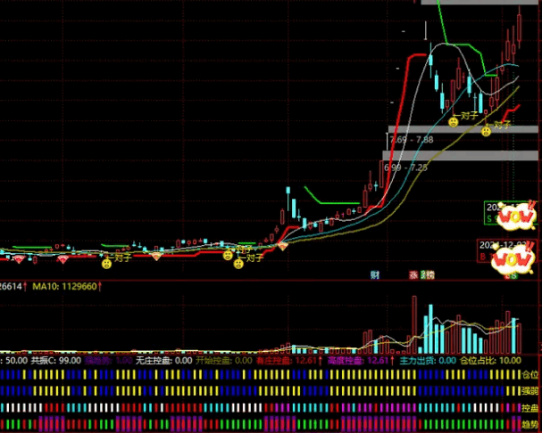 趋势那行灯颜色有三种,绿色肯定是不行蝶,红色表示有趋势,紫色是趋势共振的最佳状态,红色变紫色是好现象,紫色消失的话,最好减减仓。
