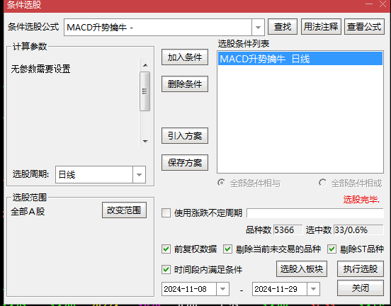 综合条件筛选:考虑当前股价与60日均线的偏离程度、过去100天的统计特征,以及一系列特定条件的组合应用,确保所选个股完全符合“MACD升势擒牛”策略的高标准要求。