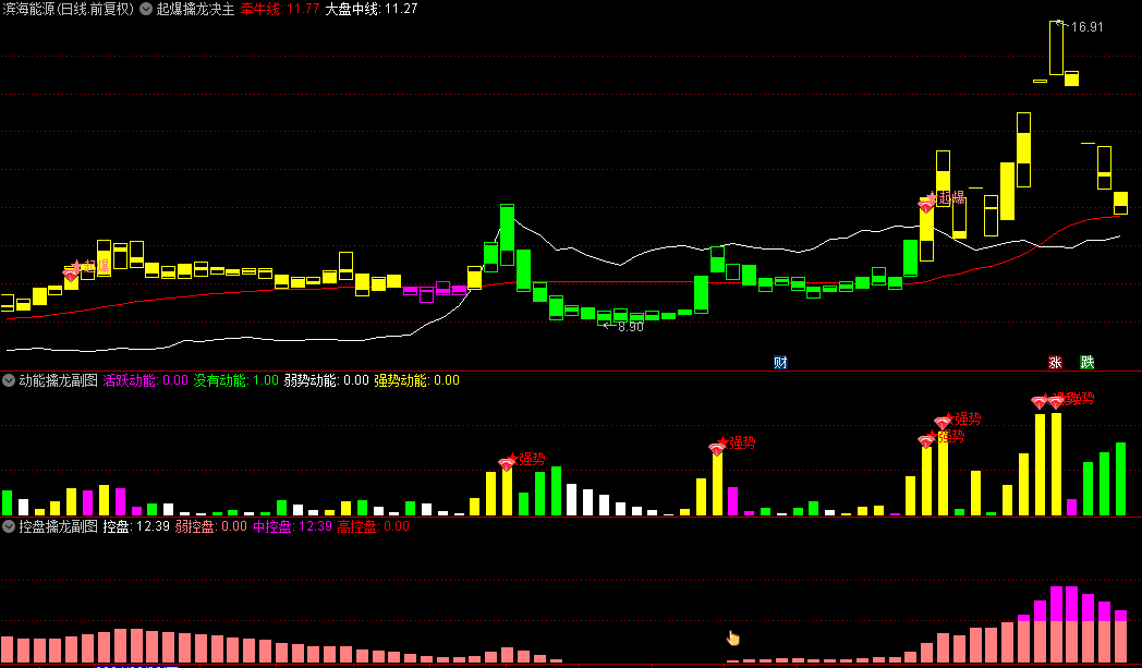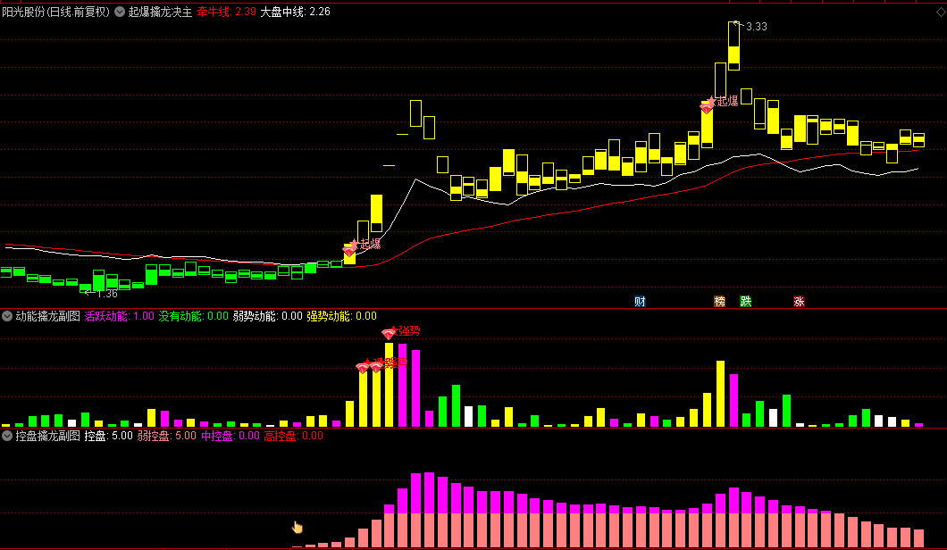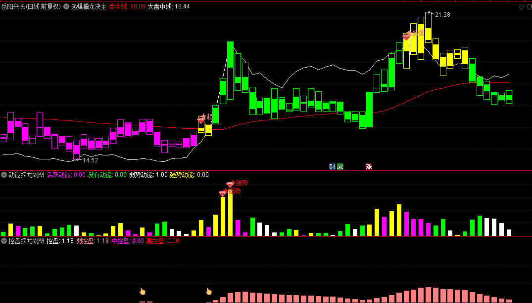 起爆擒龙决主图的起爆点与动能擒龙幅图金手指信号:这两个信号共振可以用于确认拉升,但最佳买点需要这两个信号同时出现(即共振),单独出现的信号建议忽略。