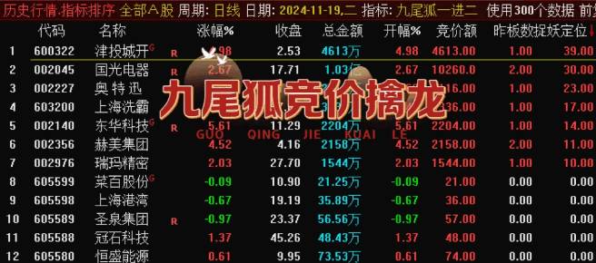 较高封板率的【九尾狐竞价一进二】主图+副图排序+选股指标,竞价擒龙模式,可当天回测!