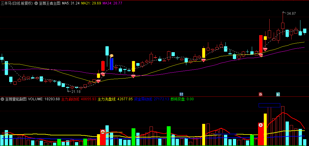 4、出击信号:当主力启动线上穿资金异动线,或主力洗盘线高于资金异动线且主力启动线上穿主力洗盘线,并且站在60日均线之上时,对应的主图发出黄色"红钻石"出击信号,表示有资金正在积极介入。