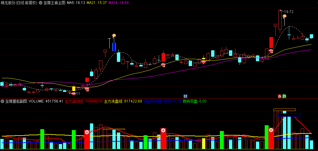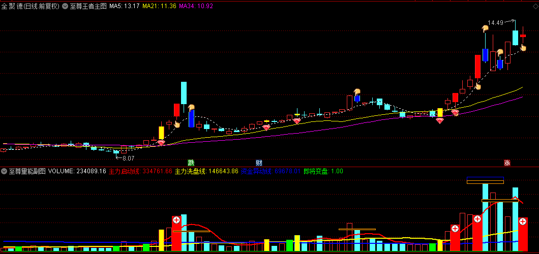 5、变盘信号:当主力启动线连续上涨,且成交量放大并上穿主力启动线时,发出绿色变盘信号,表示股价即将向上或向下变盘。