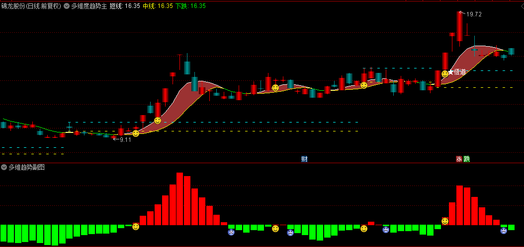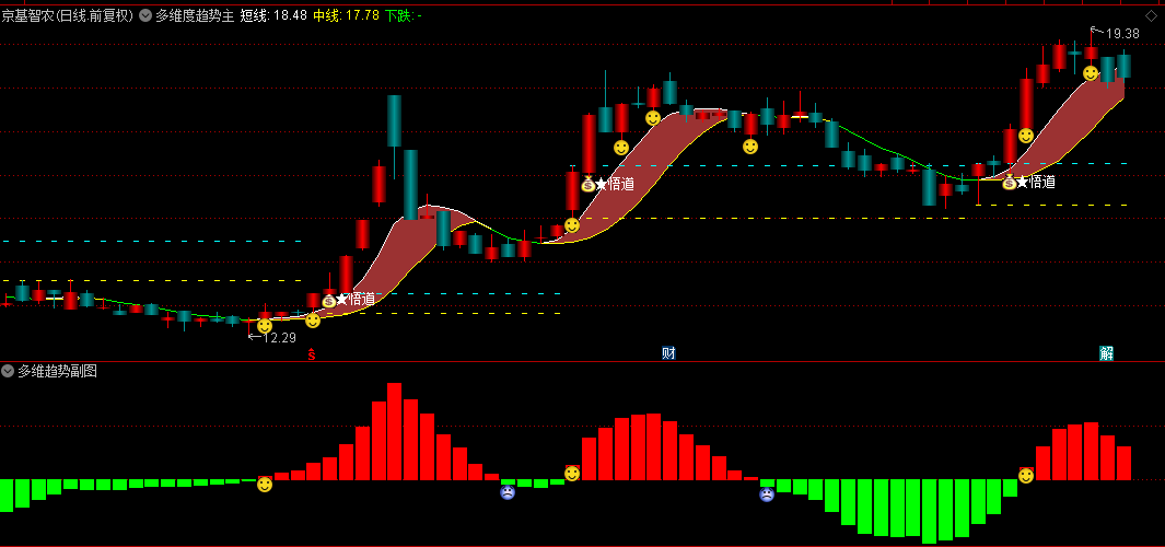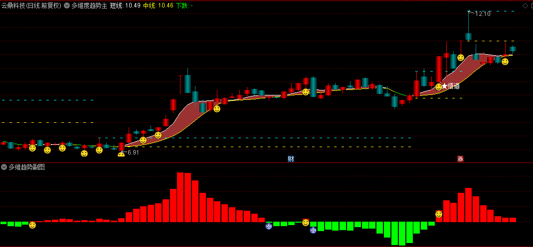 2、当MACD指标大于0、收盘价高于开盘价、中线趋势向上且价格高于短线趋势时,指标会发出"笑脸"买入信号,这通常意味着市场处于强势状态,此时可考虑买入。