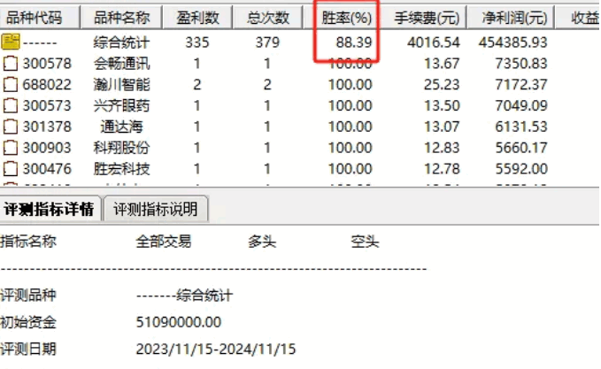 经过一年的精心评估,我们惊喜地发现,“庄控筹码制胜”策略在持股周期仅为5天的情况下,胜率高达88.39%,这一数据充分证明了策略的有效性。