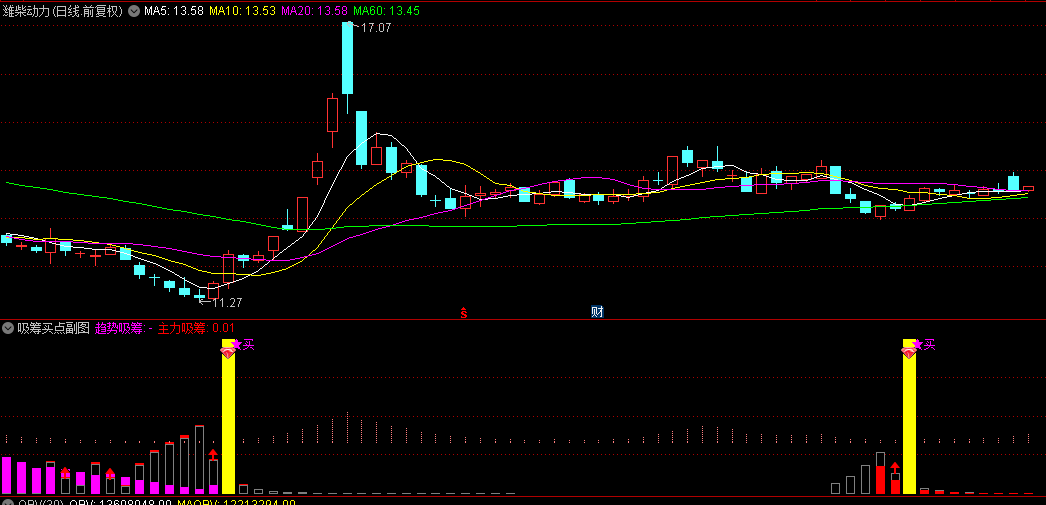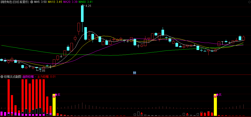 副图中的黄色长柱子,是抄底信号,这个信号做成选股指标分享,