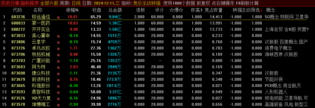 通达信【竞价主动转强】副图排序指标,竞价时段选出主力大幅加仓的强势股!