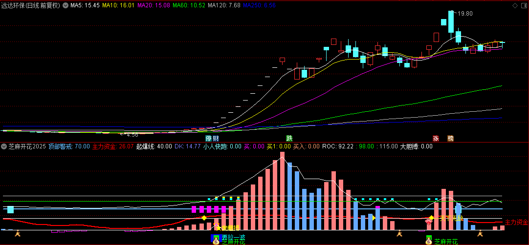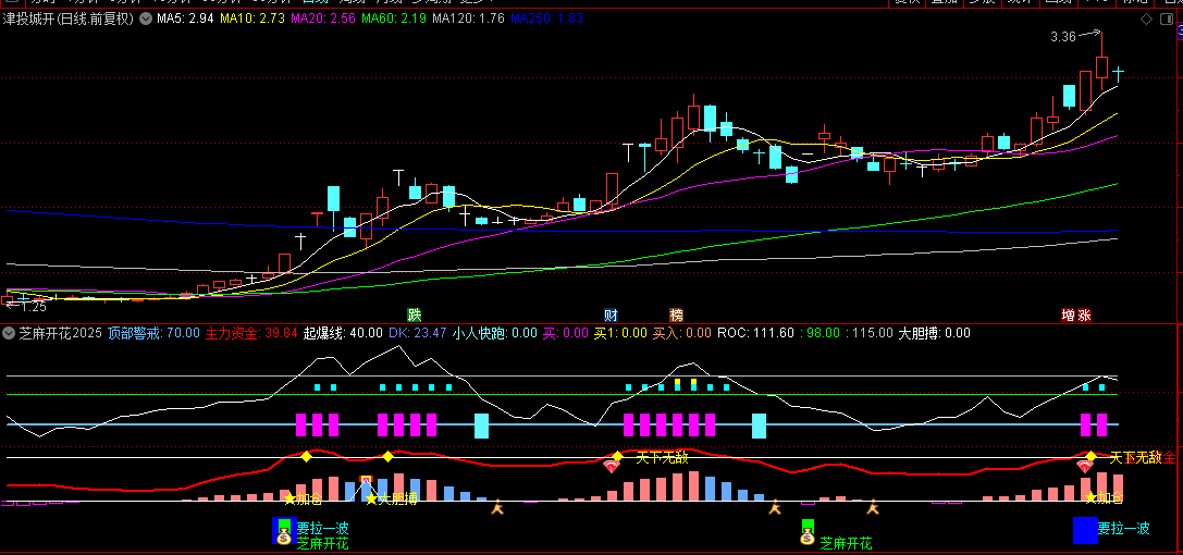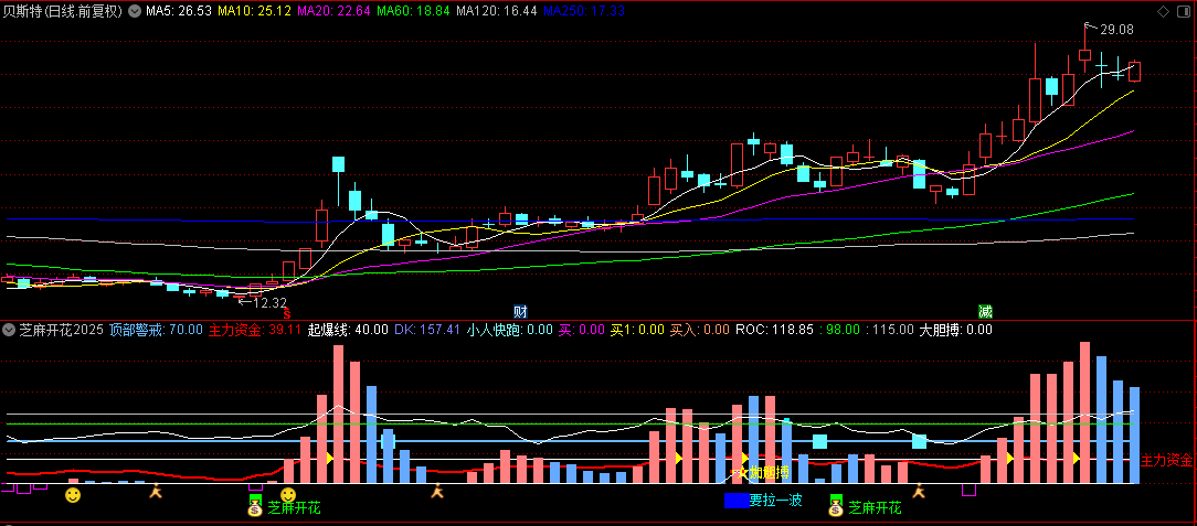 牛散张哥编写的【芝麻开花2025】副图指标,主力浮筹清理,拉升阶段一气呵成