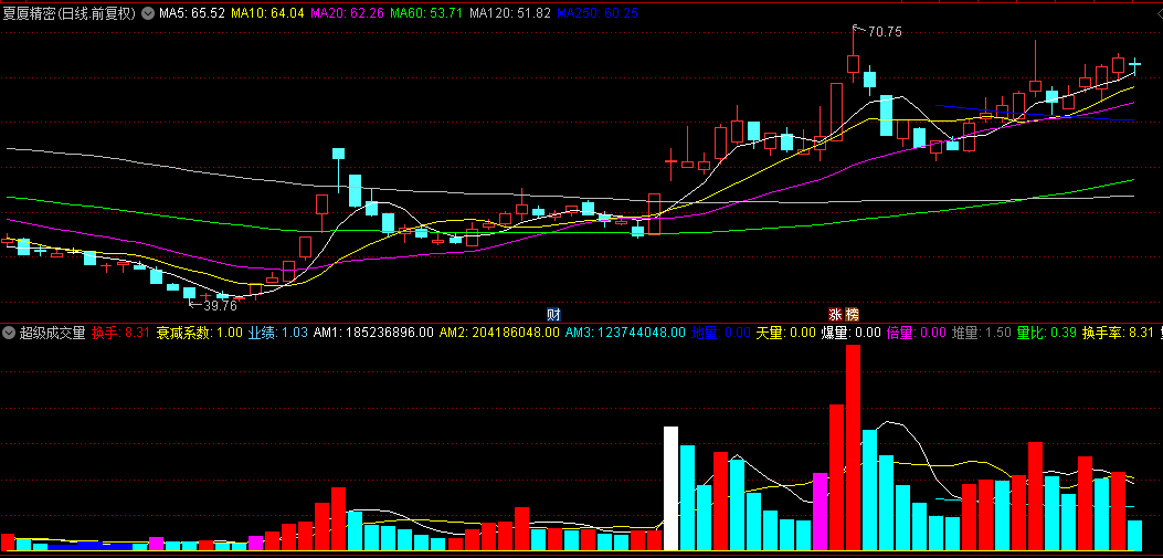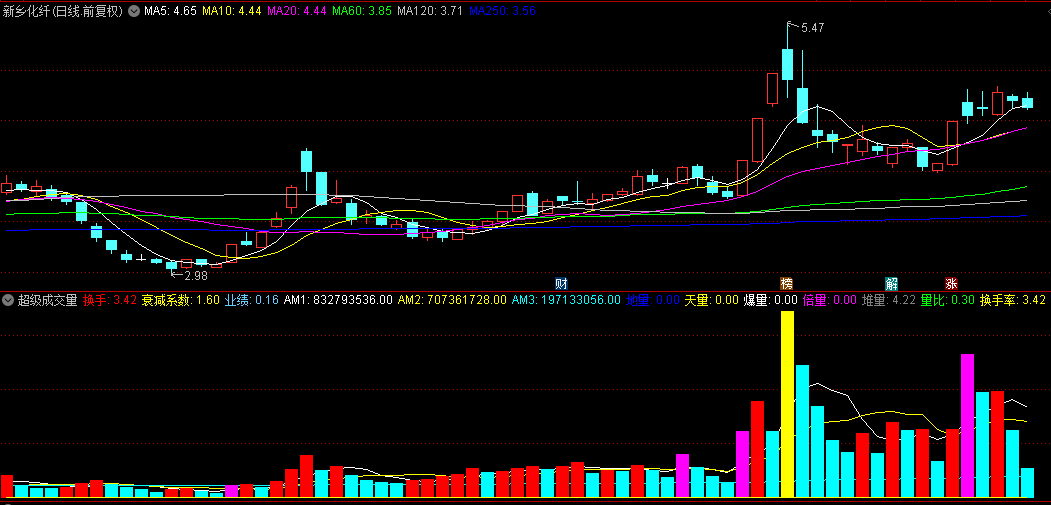 这个指标集换手,衰减系数,业绩 于一体,明确地量,天量,倍量与爆量,能直观选出比较好的股票。