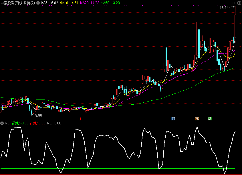 大家看贴图:主图K线 REI DMKI REI 总是非常快速的走向最高和最低峰值,而DMKI和主图K一般会随后几天才有所行动,我更喜欢配合全前面发的上了才买公式一起使用,或者大家用MACD一起也可以。