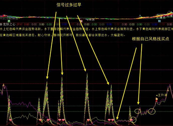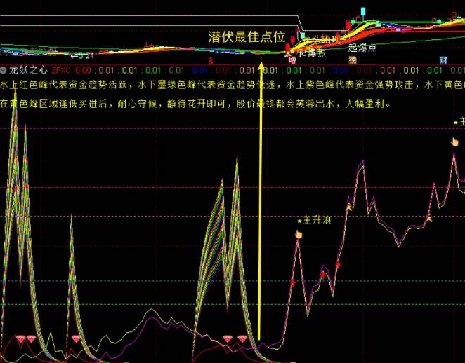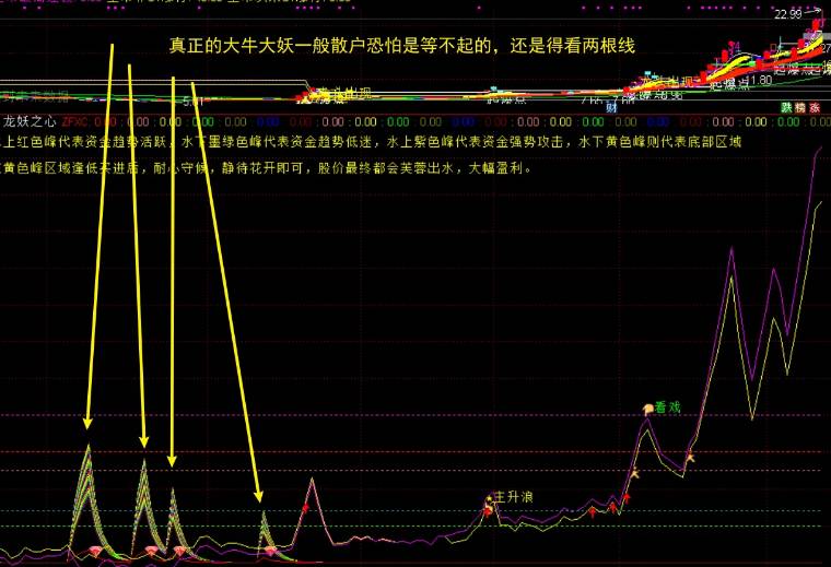 还是看那两根线金叉龙妖之心可以确认为底部信号,上穿龙妖之心出来后是最早的买点,然后上穿蓝虚线为比较舒适的买点。