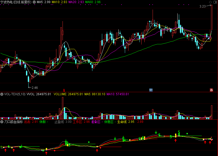 准备区:IF(C>=工作线 AND EMA(C,14)<EMA(C,25),工作线,DRAWNULL), COLORMAGENTA;