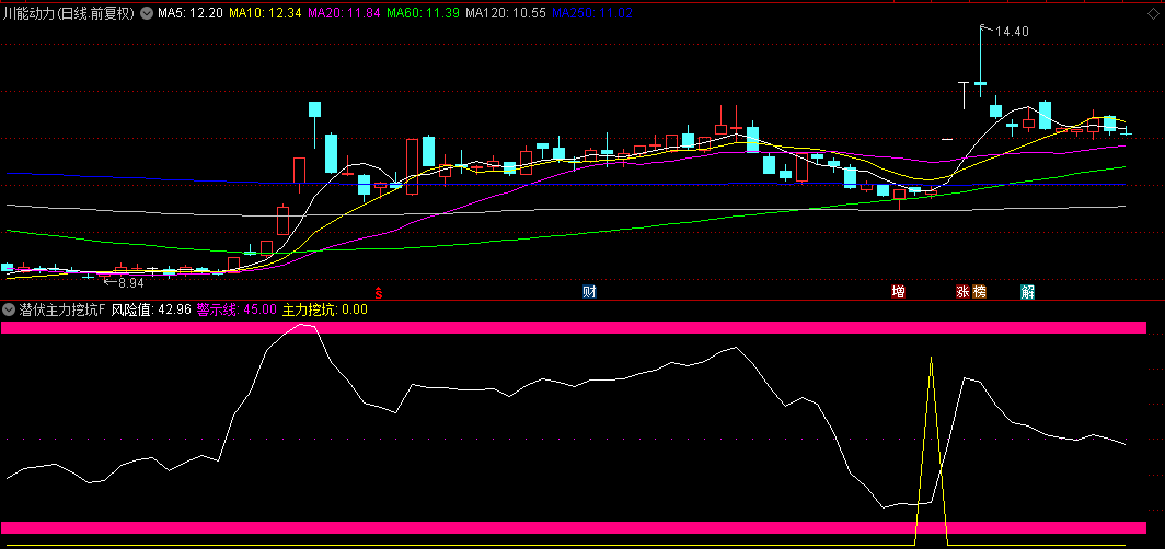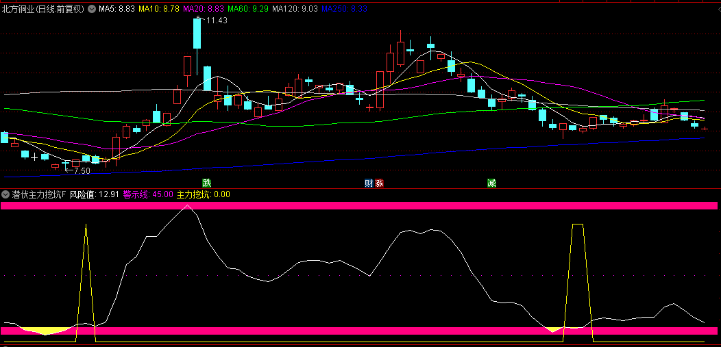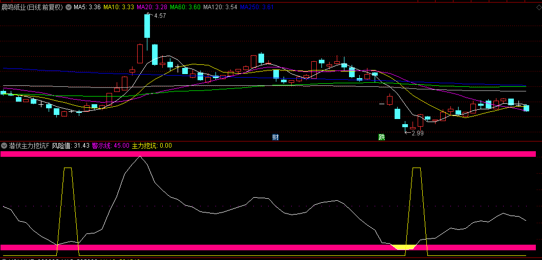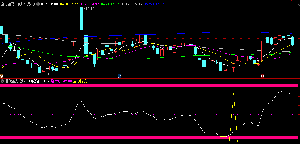 指标构成精妙绝伦:该指标由两部分红色警戒线、一条黄色买入信号(形似尖刀)以及一条白色风险值曲线巧妙组合而成。红色线段作为警戒标志,白色曲线反映风险水平,而黄色尖刀则直接指向主力挖坑后的黄金买入时机。