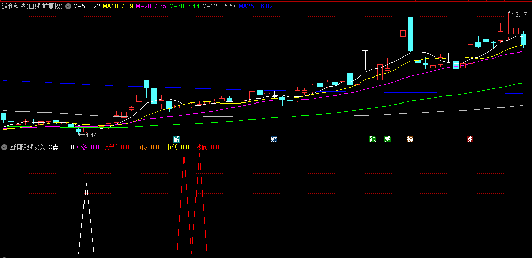 指标说明:此指标结合CCI、kdj、RSI等指标一起判断使用,其中C点信号表示CCI和KDJ在低位拐头向上,并且股价处于8日的最低位或次低。