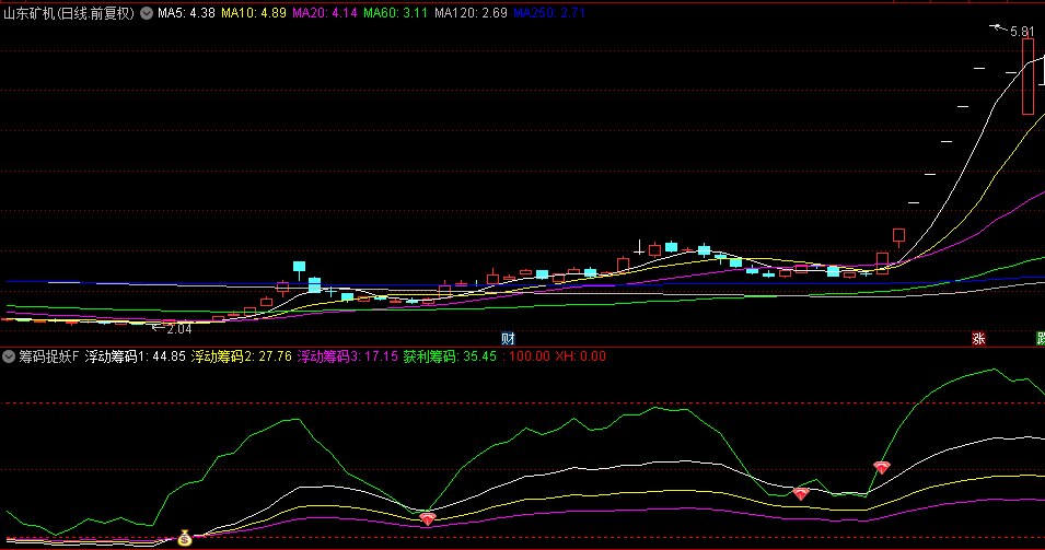 而当三条浮动筹码线开始金叉,而获利筹码线在明显的上部位置,是资金开始活跃的标志,标注为钱袋子;