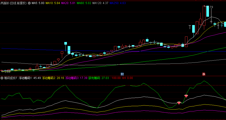 当获利筹码从高位向下快速死叉浮动筹码,而后又快速金叉浮动筹码,一般都是洗盘阶段,金叉时标注为红钻,这个时候进场,基本上每次都能做好一个波段盈利;