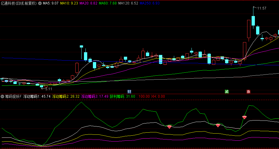 白色线是浮动筹码1,黄色线是浮动筹码2,紫色线是浮动筹码3,是设置了不同周期中,浮动筹码的波动情况;
