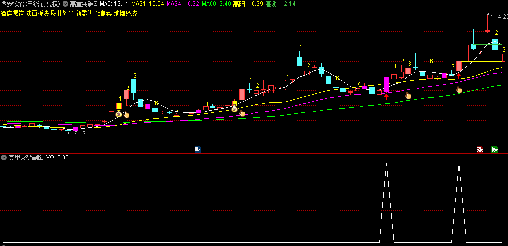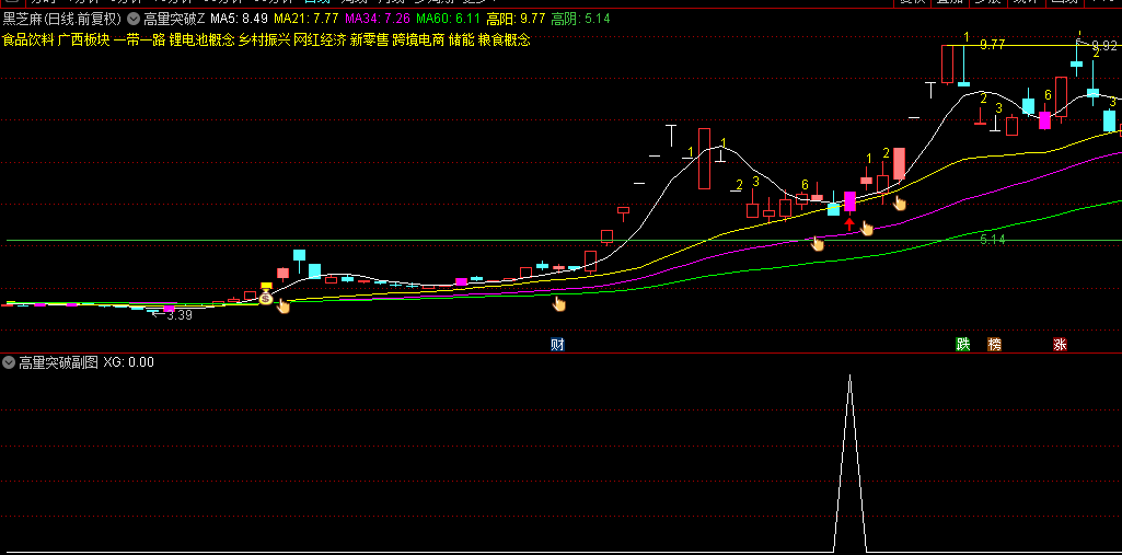 通达信【高量突破】主图+副图+选股指标,成交量大幅放量,长阳上档突破!