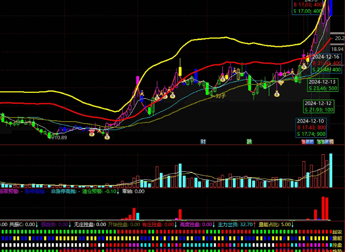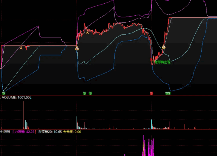 紫色柱表示当前出去上升趋势,且控盘较强;
