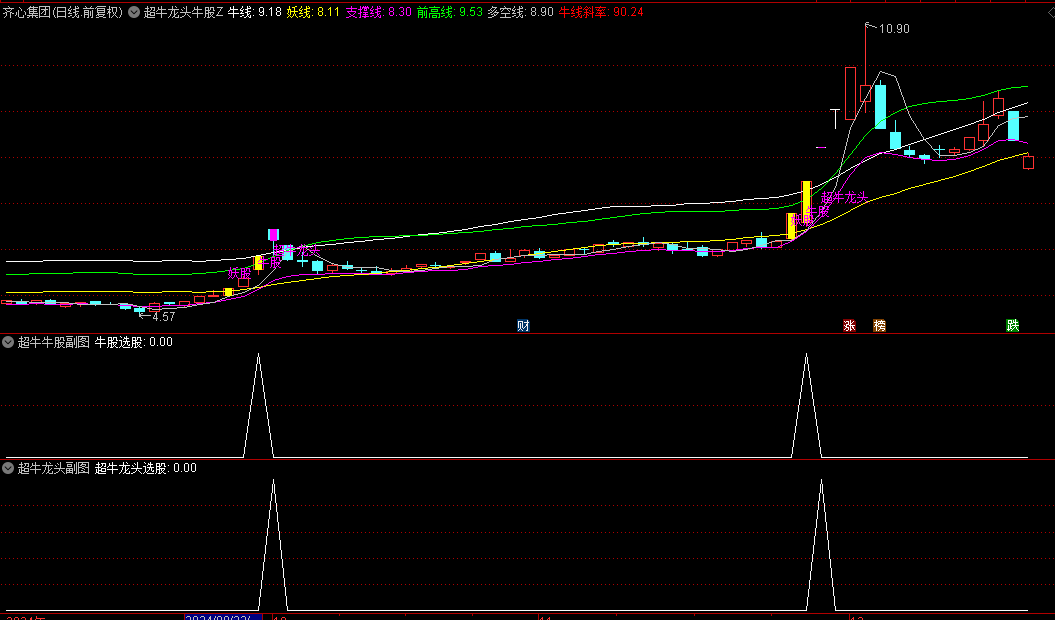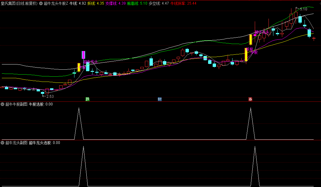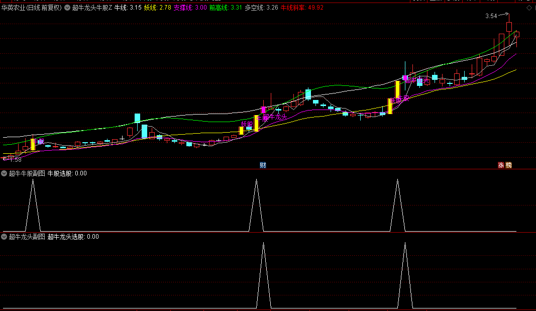 三个信号,牛股、妖股、超牛龙头,分别都用文字在主图标记了,供你选择!