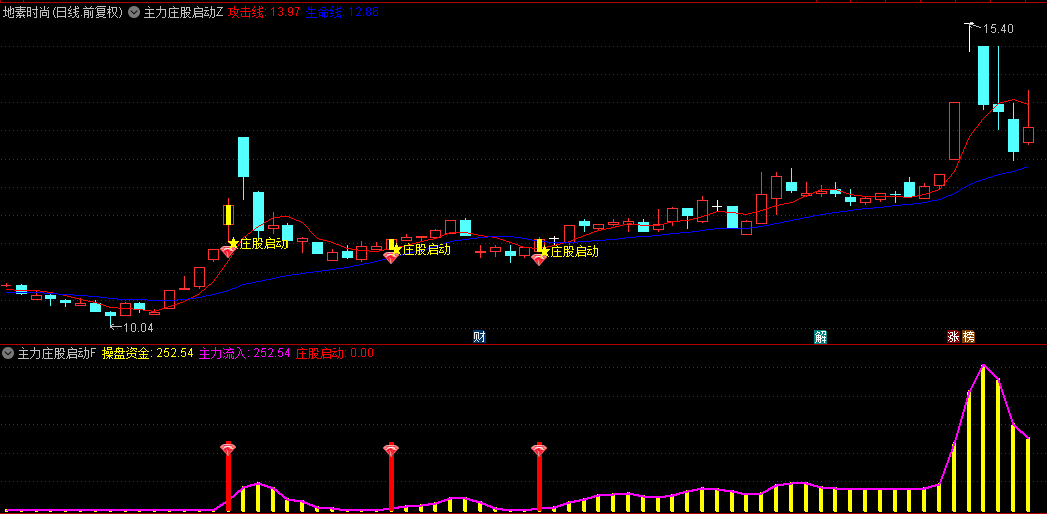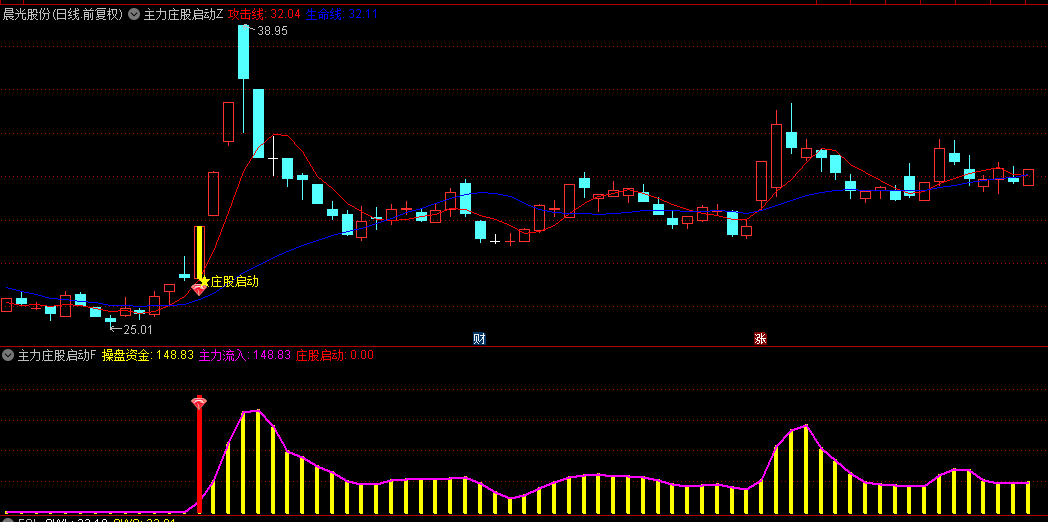 副图出现顶部带有红钻石的红色柱子,主图出现K线出现橙色标记和庄股启动文字提示时,就是主副图共振的主力庄股启动信号,可以予以关注!!!!