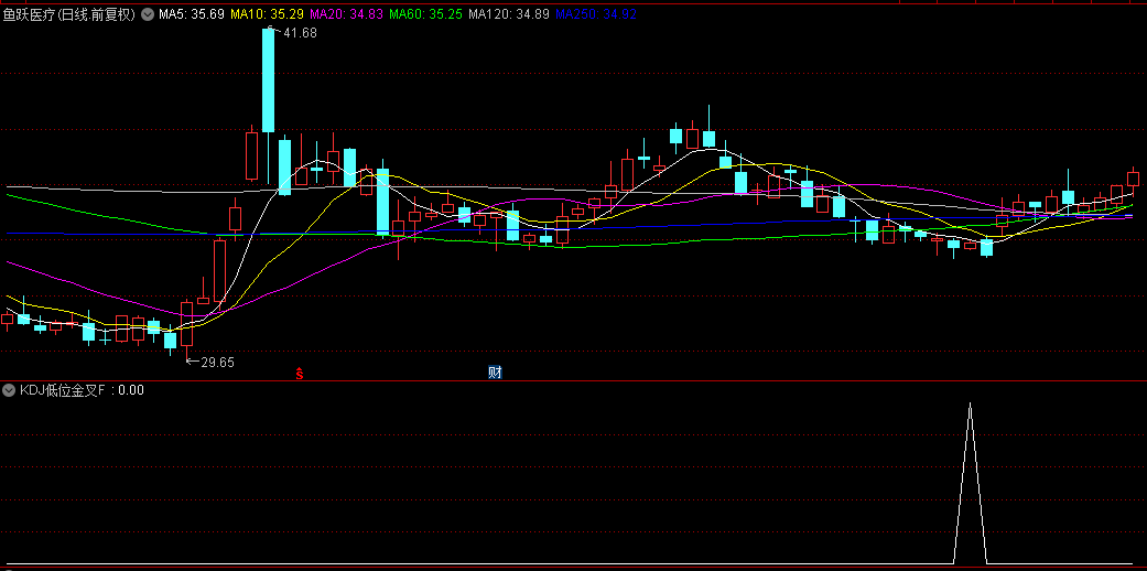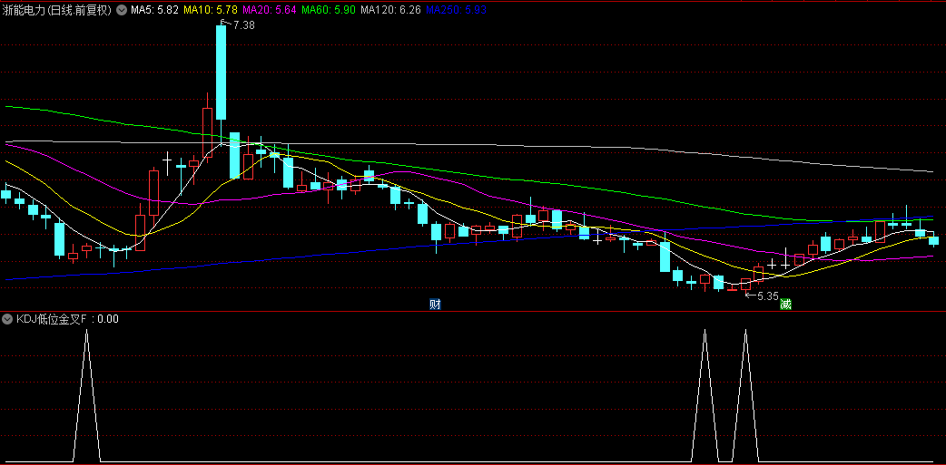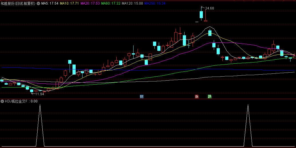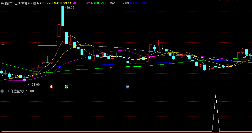 然后低位的条件,因为J值最大,最后 J<20,则限制了KDJ金叉时三条线的均在20下方,就是低位金叉。