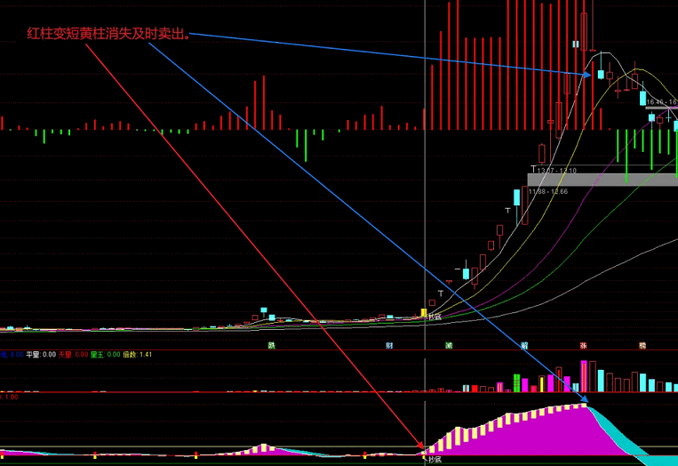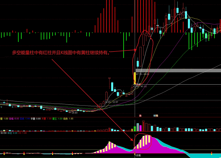 多空能量柱中有红柱并且K线图中有黄柱继续持有,红柱变短黄柱消失及时卖出。