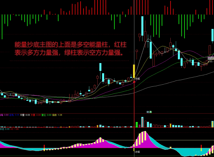 能量抄底主图的上面是多空能量柱,红柱表示多方力量强,绿柱表示空方力量强。