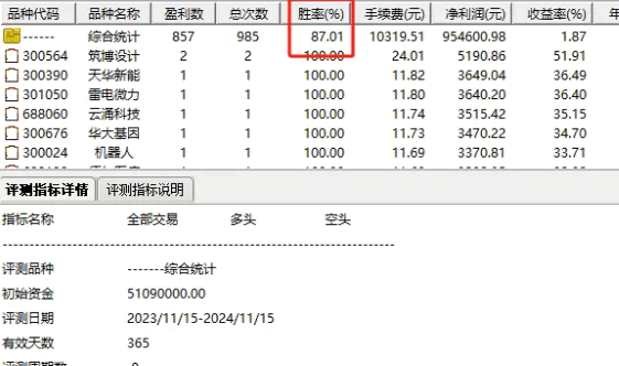 持股周期2天,胜率:87%。正向年收益95.4万;共出手985次。