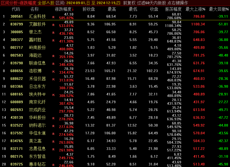 今天再更新一下9月以来的涨幅排行,当前涨幅在200%以上的有46个,最高涨幅汇金科技的585.82%,比上周要低一些。