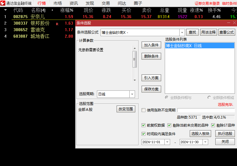 通过实际测试与验证,通达信博士金钻抄底系统展现出了卓越的选股能力与抄底精度。在多个市场周期中,该系统均取得了显著的投资回报,为投资者带来了丰厚的收益。同时,其简洁直观的操作界面与高效稳定的运行性能,也赢得了广大投资者的青睐与好评。