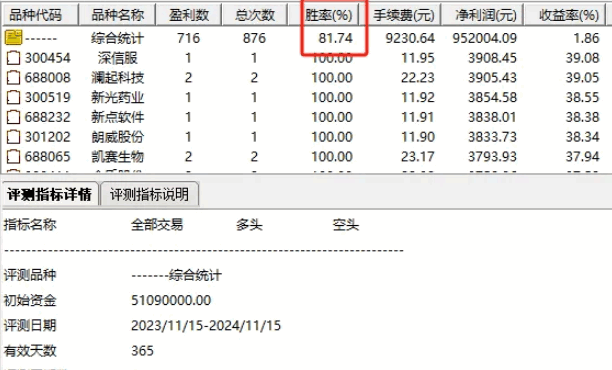 在两天持有期内,该策略实现了81%的胜率,年化正向收益达到952,000元,期间共进行了876次交易操作。