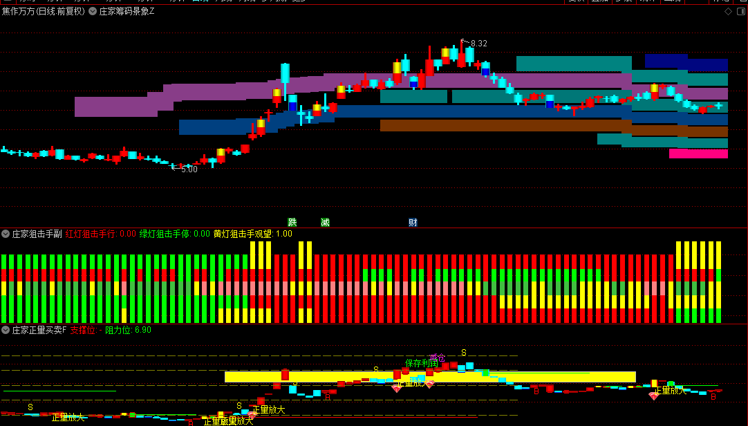 全套指标包含了五个指标,分别是庄家筹码景象主图、庄家异动乖离副图、庄家反向寻底副图、庄家正量买卖副图、庄家狙击手副图。