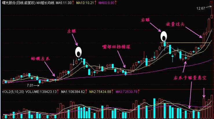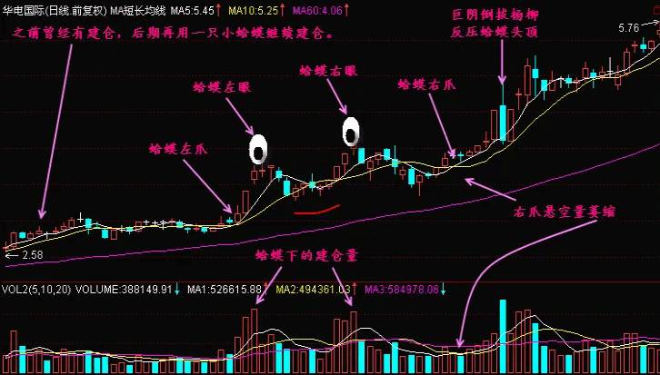 技术面上,前面主力开始收集筹码放量时,5日、10日均线突然拐头向上形成蛤蟆的左爪,第一波上升浪的高点位置形成蛤蟆左眼,之后开始回调形成蛤蟆的嘴巴。