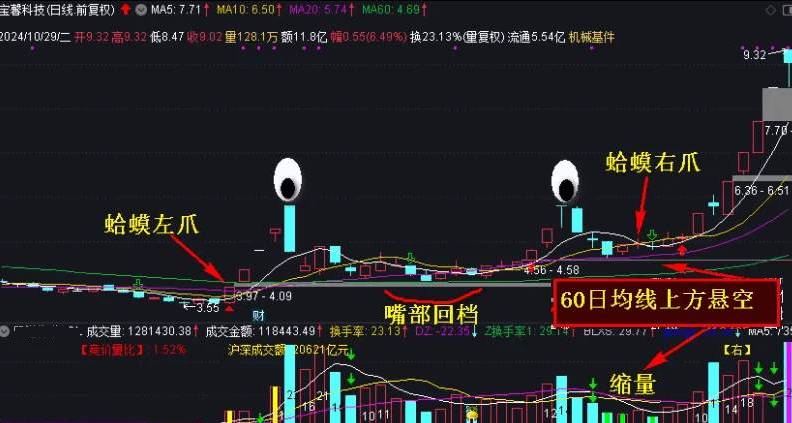 比如近期的宝馨科技,它就是典型的金蛤蟆形态,10月8号的高点形成蛤蟆的右眼,之后回调极度缩量,形成蛤蟆的右爪!