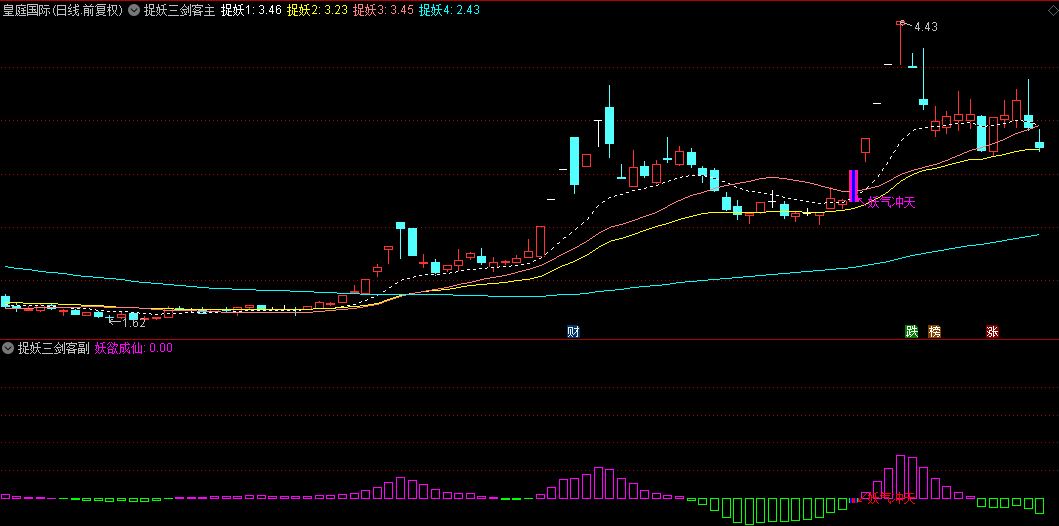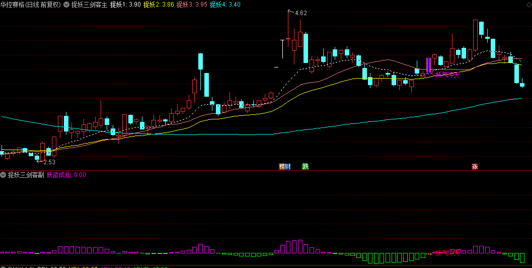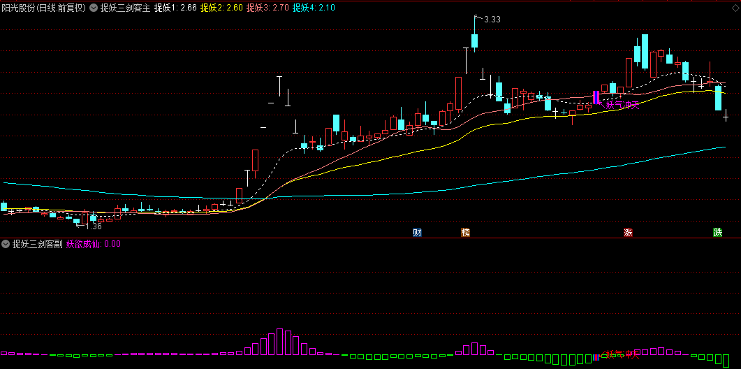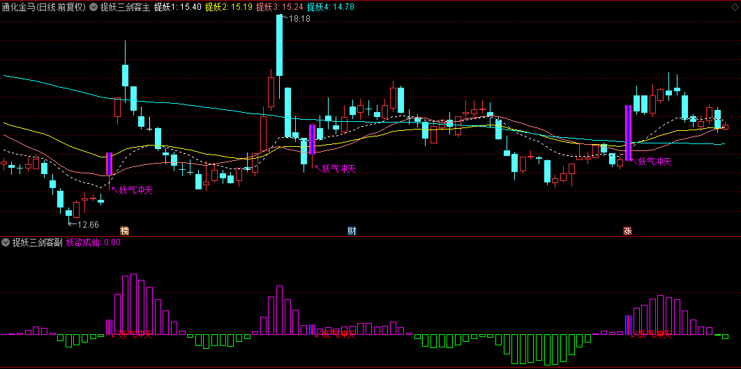 为了更直观地指导投资者操作,“捉妖三剑客”的副图部分特别设计了洋红色柱子。