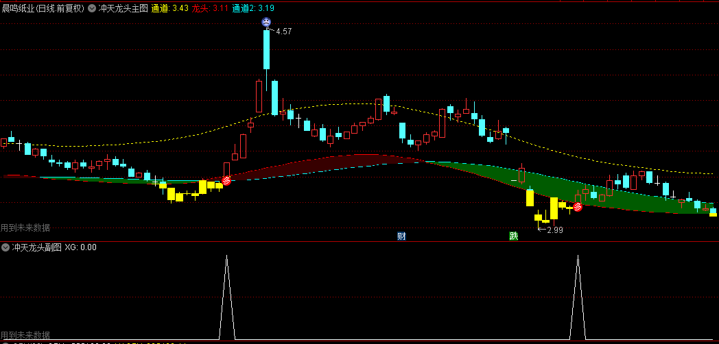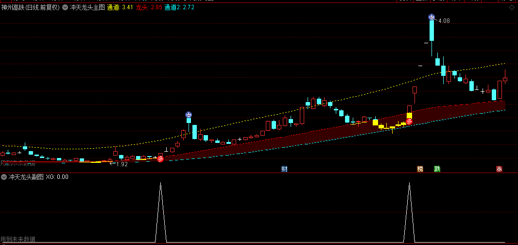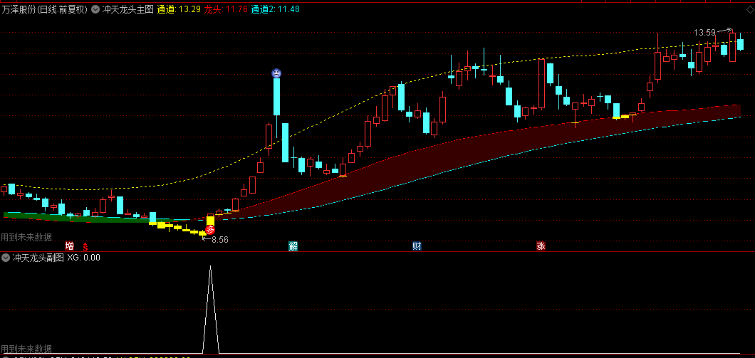 主图显示三条通道线,黄色虚线是通道线的上轨,一般股价很难打到这条线,但是一旦突破这条线,那么一定是妖股出现,后面每次回调都是进场的机会,因为趋势已经出现;