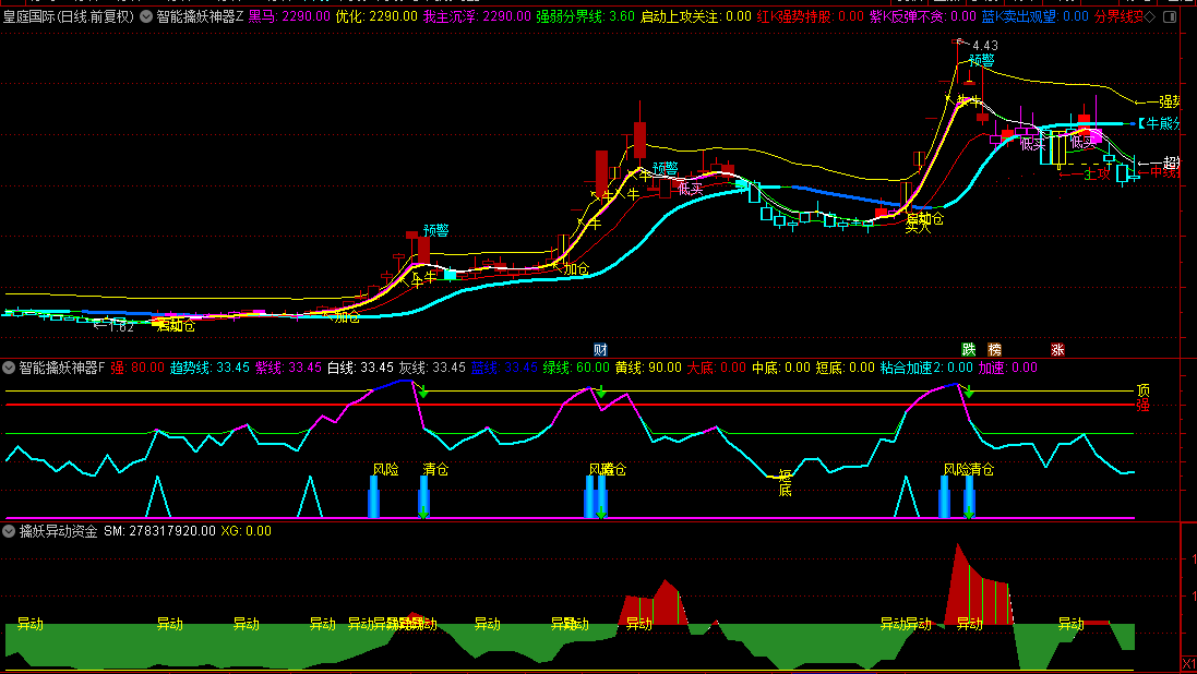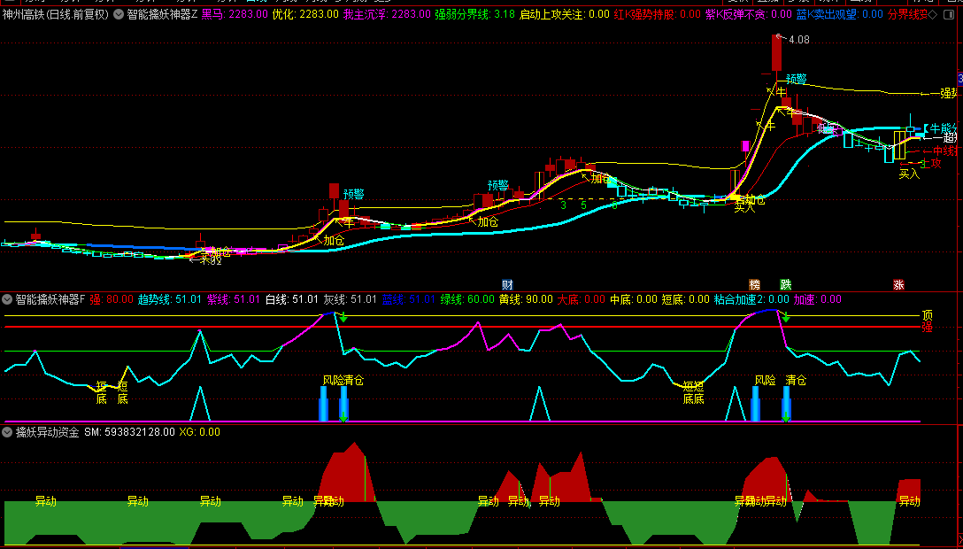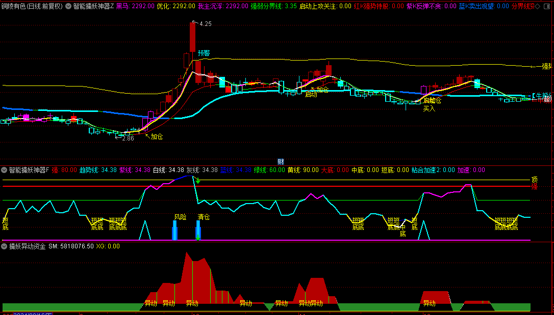 副图1则承担起了风险管理的重任。当风险信号出现时,它会毫不犹豫地发出减仓的指令,让投资者能在市场波动中保持冷静,避免损失扩大。而清仓信号的发出,则是对市场极端风险的预警,此时,全部离场是最明智的选择。同时,副图1还具备短线底部的识别功能,短和底信号的出现,如同黑暗中的灯塔,为短线投资者指明了前进的方向。