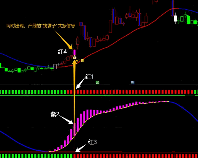 当副图中“红1+紫2+红3+主图红4”等条件同时满足时,触发“钱袋子”共振信号,预示市场可能即将迎来强势上涨行情。