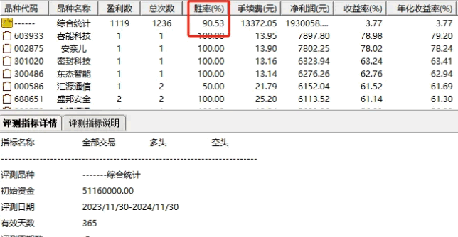 本次评测的公式名为与游资同进退,评测时段选定了2023年11月30日至2024年11月30日,这一年的时间跨度足以检验该指标的稳定性和有效性。