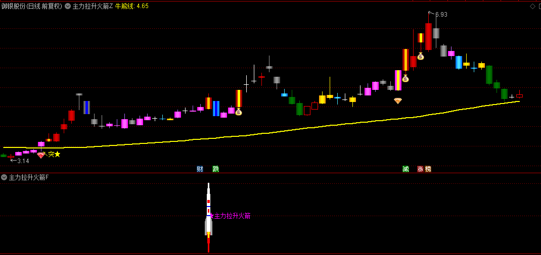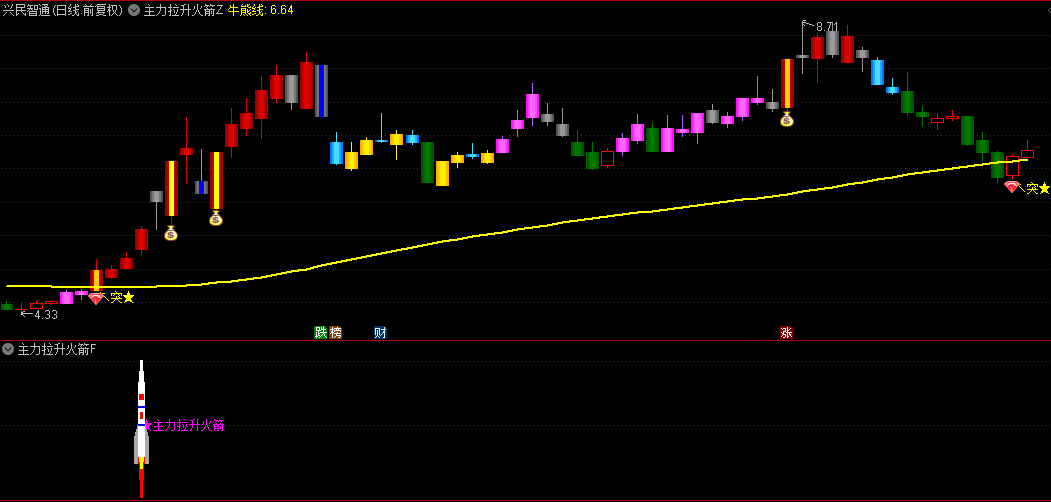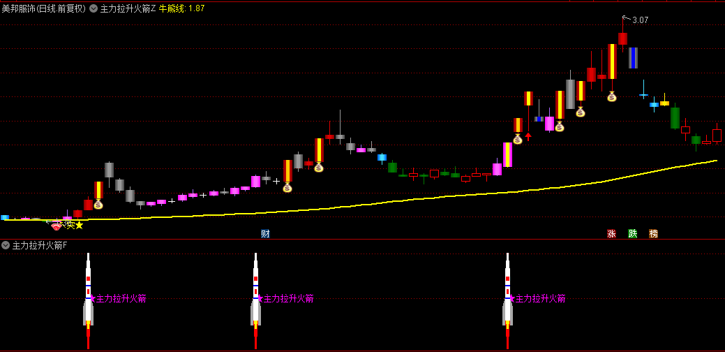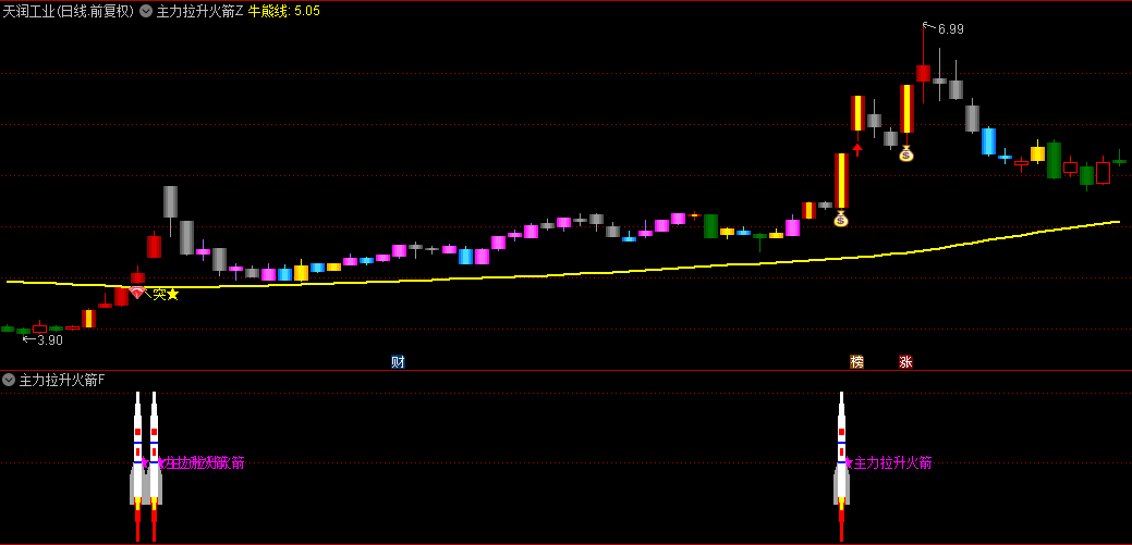 火箭发射、火箭升空信号:当特定条件满足时,发出强烈的买入信号,用“★主力拉升火箭”标记,并配以醒目的颜色渐变,提示强烈的上涨预期。