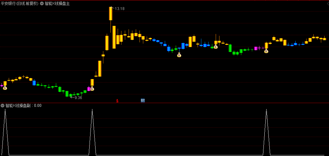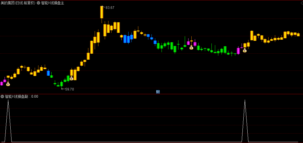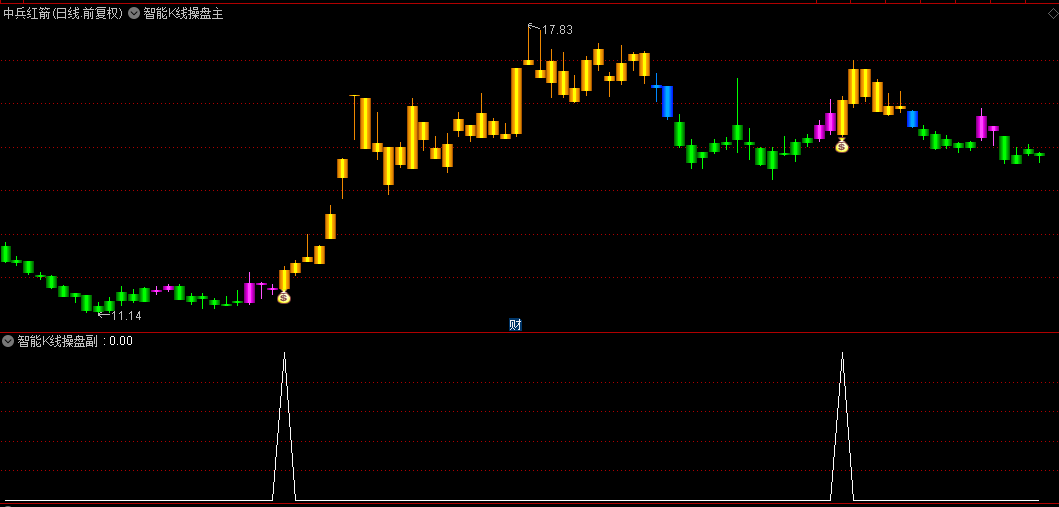 在运用【智能K线操盘】指标进行投资决策时,投资者需特别注意洋红色K线的出现。