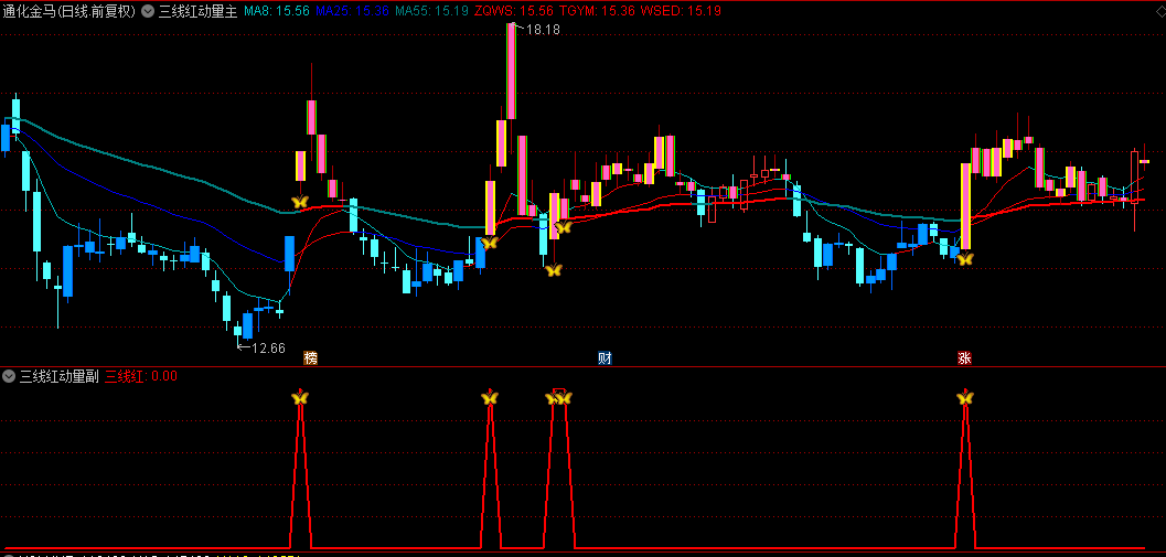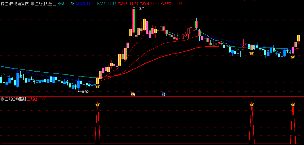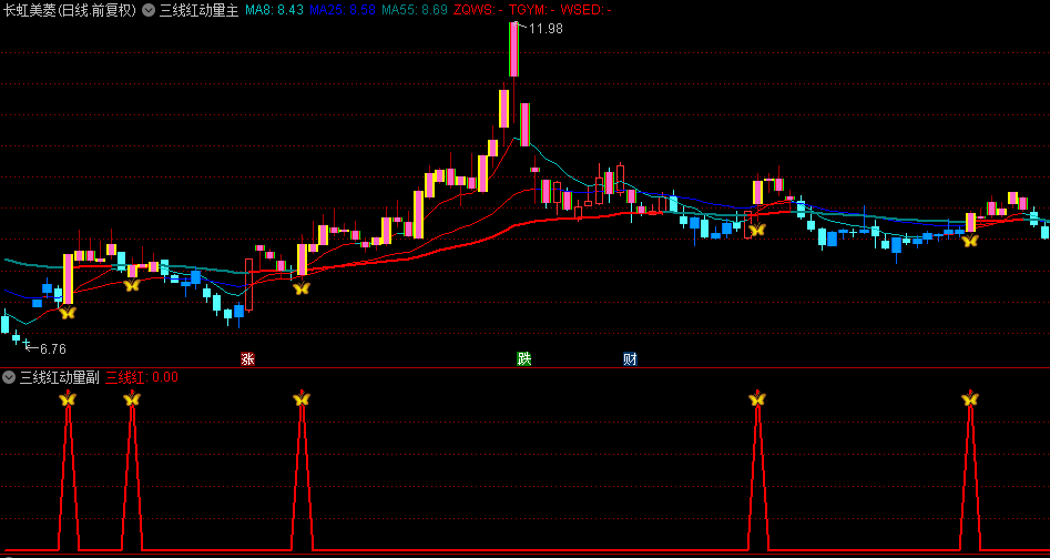 更为神奇的是,该指标还具备“三线红信号”功能。当8周期、25周期和55周期的EMA线同时显示上升趋势,并且市场动能也呈现出积极态势时,指标会发出金蝴蝶的买入信号。这一信号如同金蝴蝶翩翩起舞,预示着市场即将迎来一波主升浪,投资者此时入场,往往能够捕捉到市场的丰厚收益。