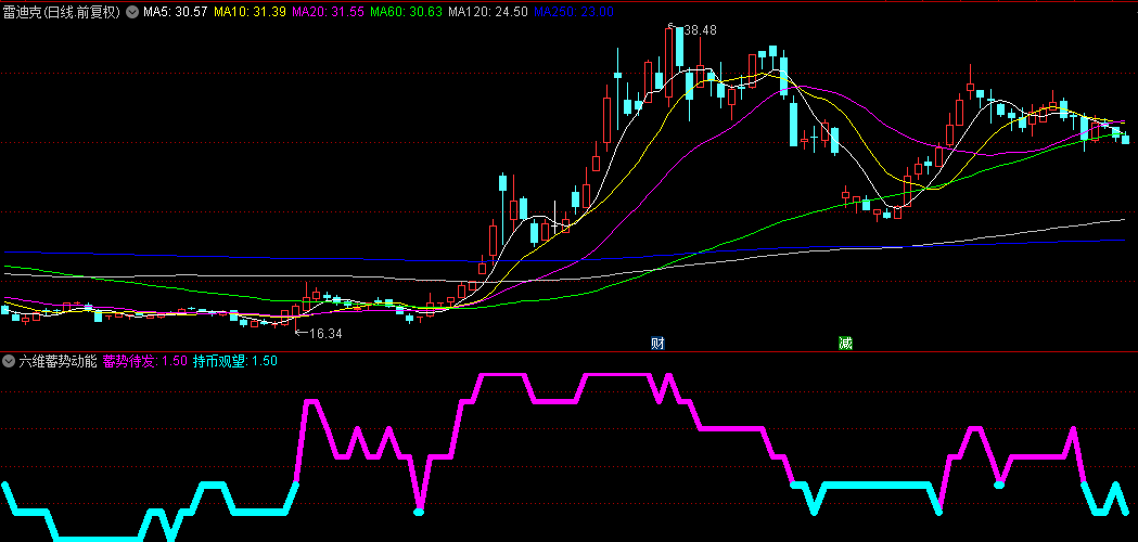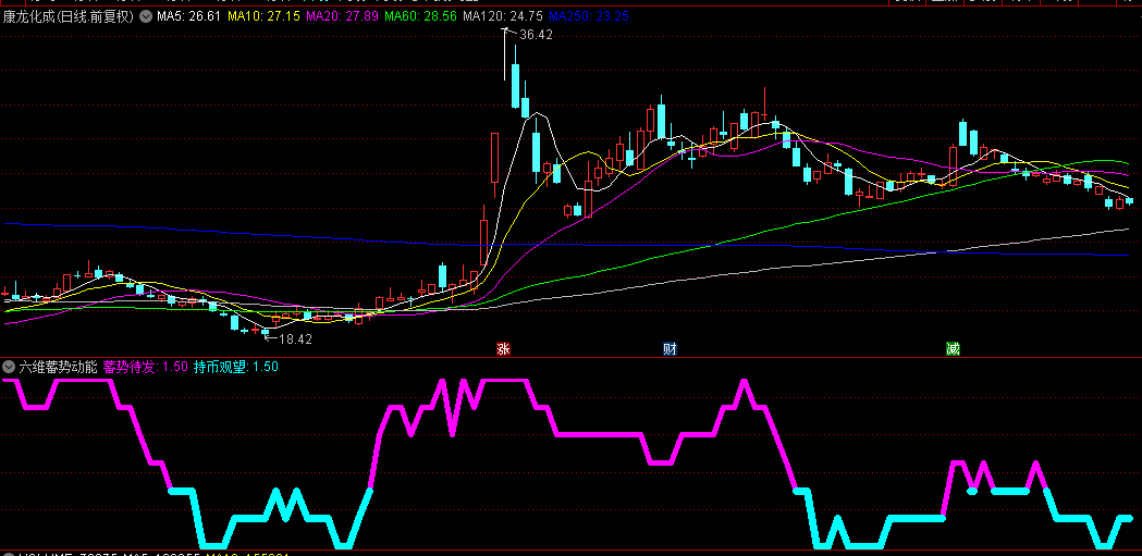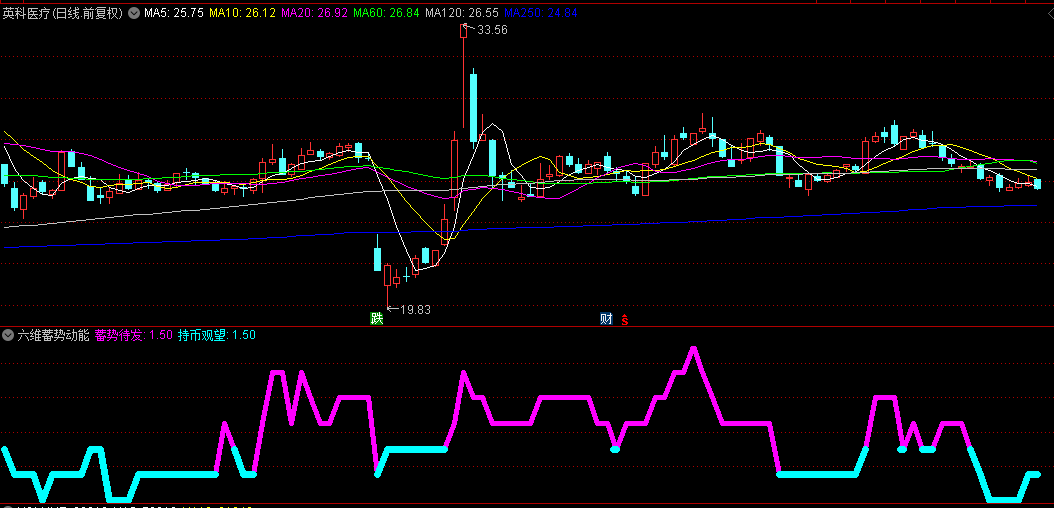 为了更直观地展示市场的蓄势状态,我们在图表上以品红色、线宽为5的线条绘制SDMAI值。