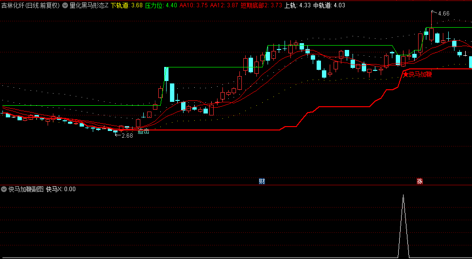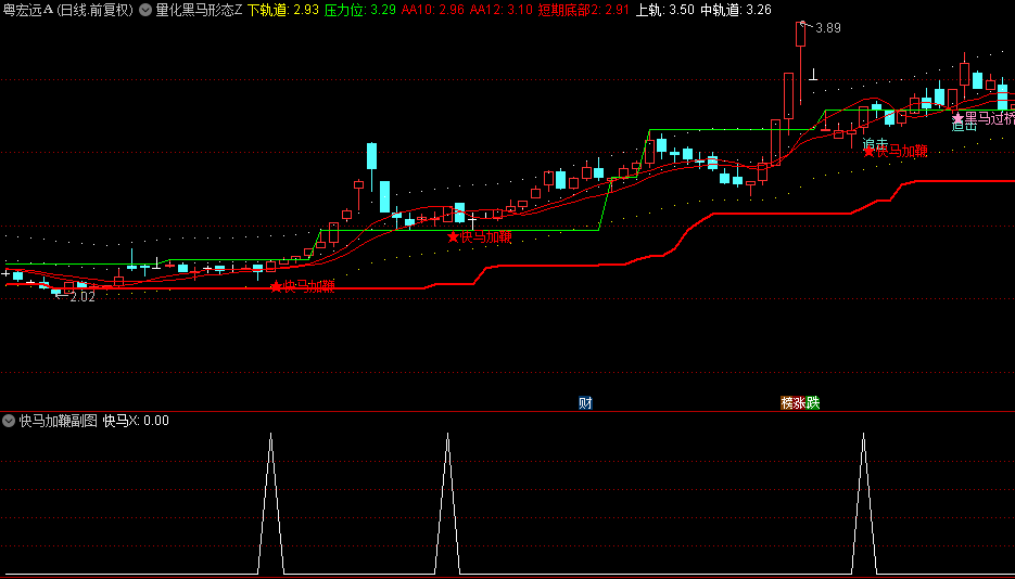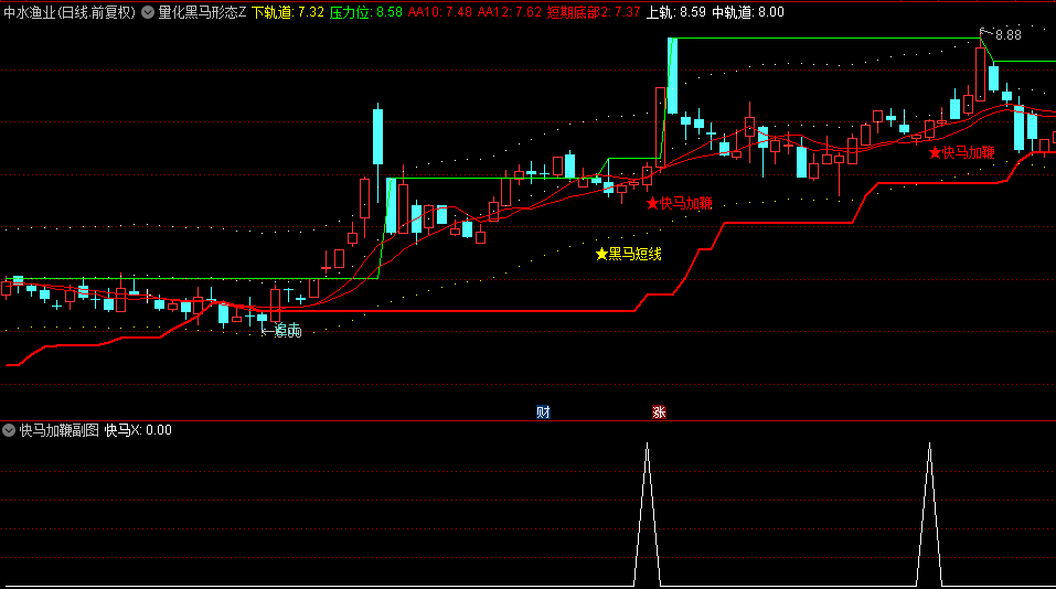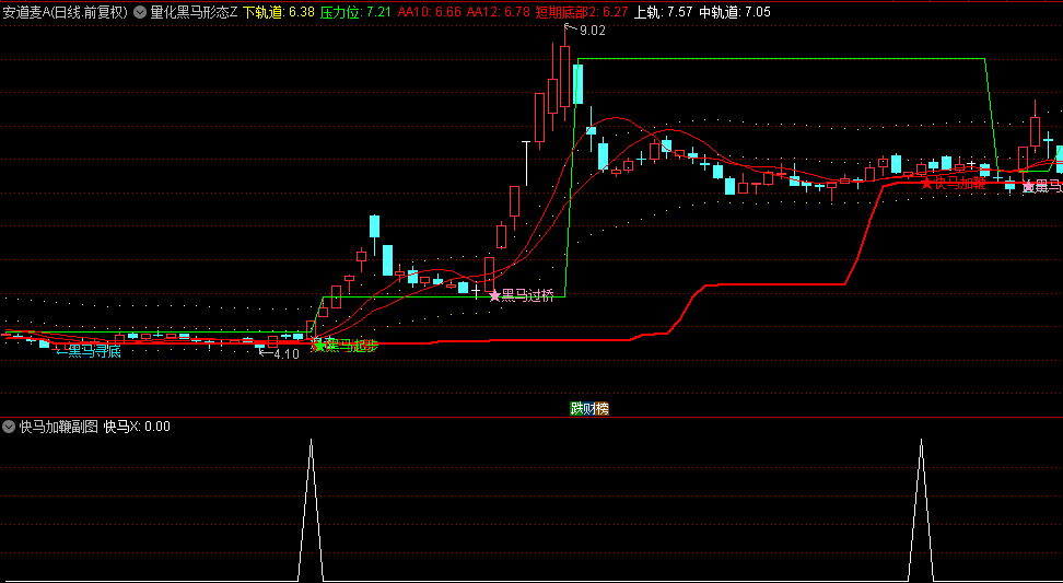 功能:将黑马个股的整个过程全信号标注出来,包括黑马寻底信号、追击信号和短线快马加鞭信号。