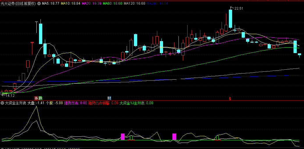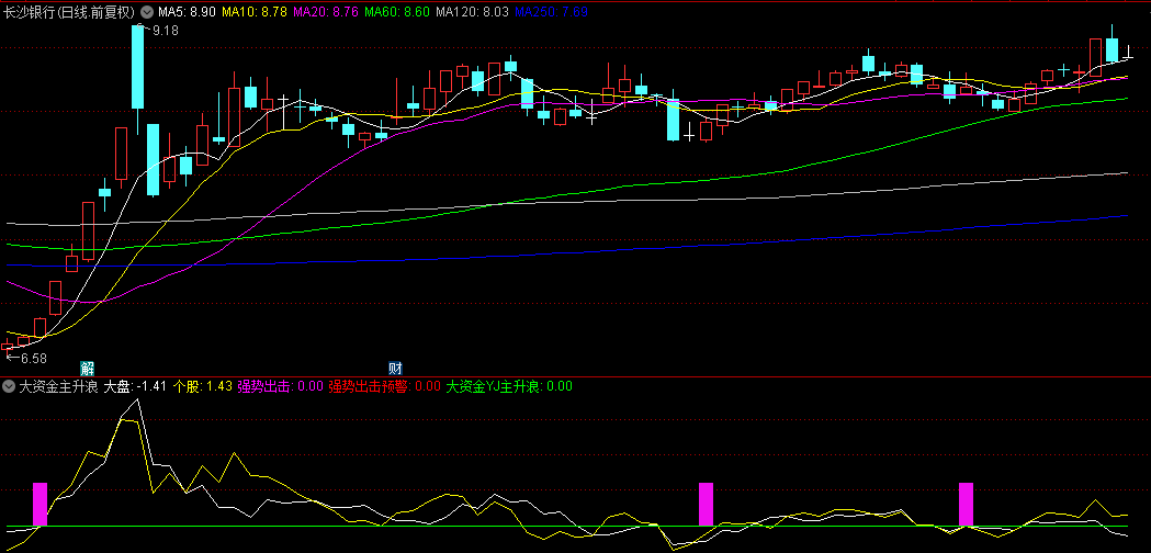 大资金主升浪副图及选股指标设计巧妙,其核心在于两条趋势线的运用:一条是白色线,它代表着大盘的整体走势;