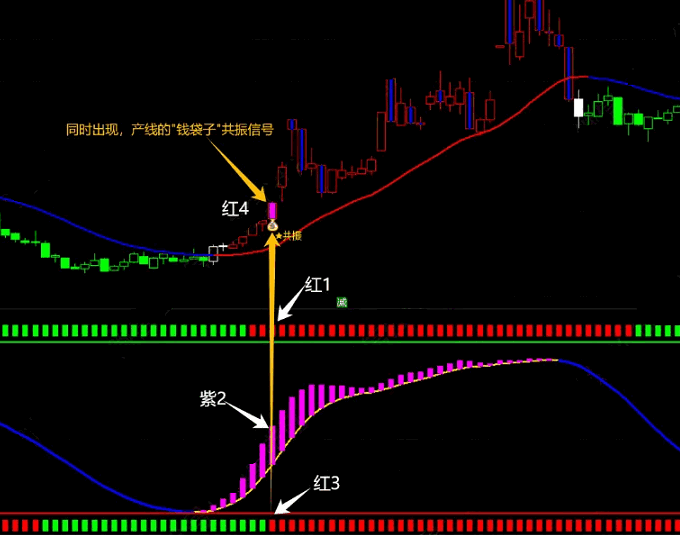 当副图中“红1+紫2+红3+主图红4”等多重条件同时达成时,触发“钱袋子”共振信号,预示市场可能即将迎来强劲上涨行情。