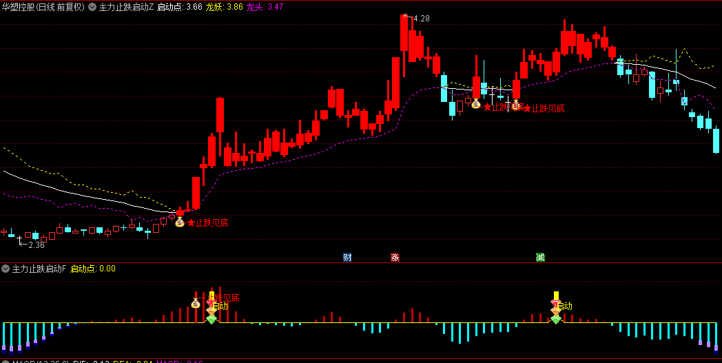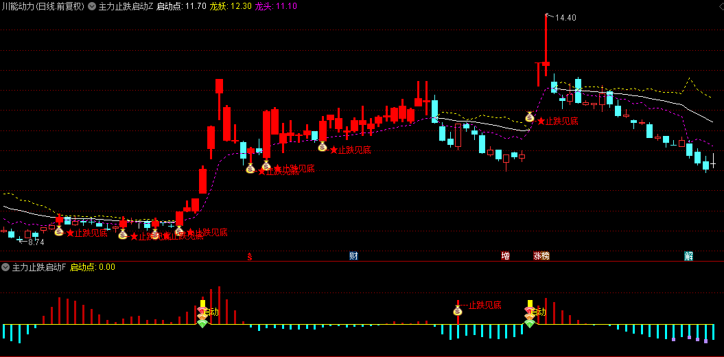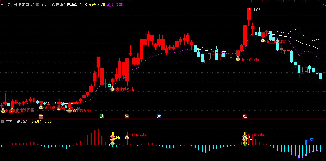 当股价穿越启动点时,以红色柱线突出显示,同时配以特定的图标和文字提示“止跌见底”,直观明了。