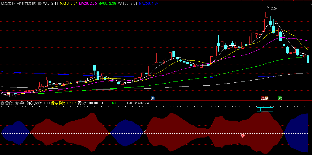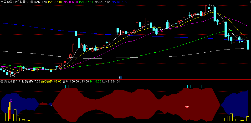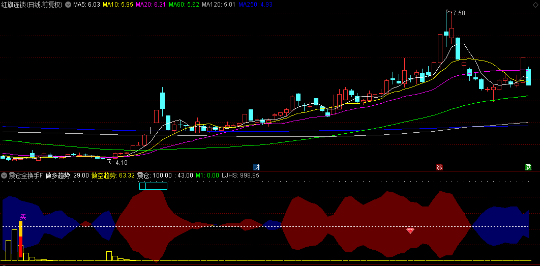 震仓全换手副图指标,红色和蓝色的带状区间清晰地划分出了多头和空头的势力范围。